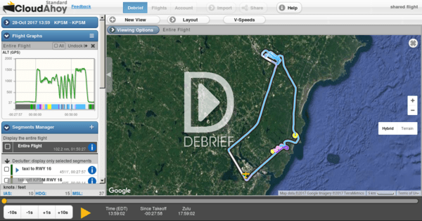 I was also so focused on trying to have a symmetrical ground track, I wasn’t flying well: my turns weren’t coordinated (you’ll hear John reminding me to use my rudder if you play the debrief), and my airspeed and altitude had some wide fluctuations:
